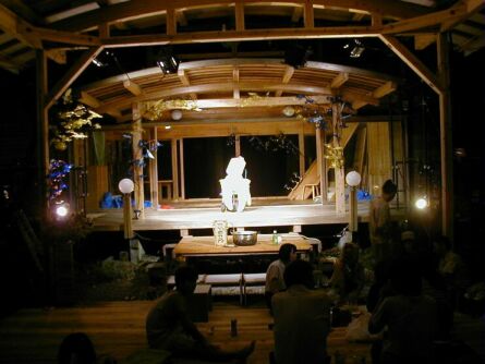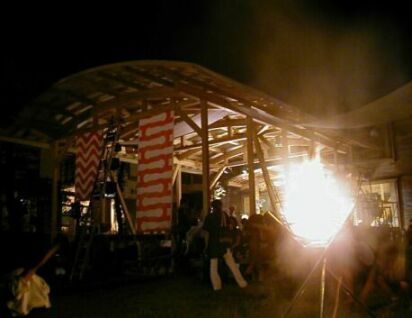 奥に見える建物が劇場、手前は客席。この客席は今回の公演のために(?)建てられました。 かがり火がたかれる中でお芝居も行われました。 |