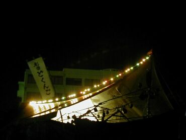 同じく夜のテント。テントの向こうに見えるビルが「レベルアップセンター」という学習塾で、そのオーナーご夫妻にいろいろお気遣いをいただきました。