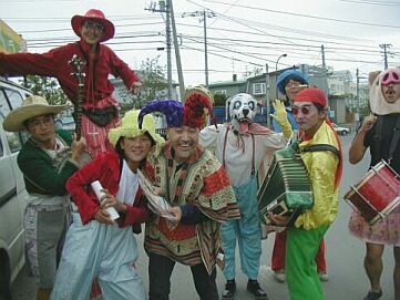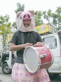 京都のSくん。旅の前半から中盤、多くの公演地にお客さん兼助っ人として出没。 北海道に入ってからは劇団の全行動に張り付きでつきあってくれてます。準スタッフは正スタッフよりもよく働く…。 この日は女装ヒゲ豚となってチンドンに花を…添えて…くれてます…。 |