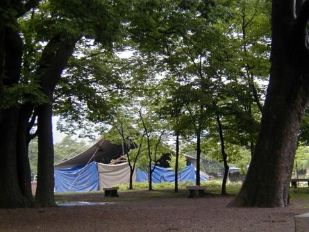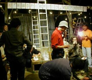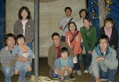 ![]() テント内での祝賀会の模様です。 「祝『街頭夢売り転戦ゲリラ』結成15周年!!」の文字が読めるでしょうか。 15本のロウソクの立ったケーキも写ってます。 |