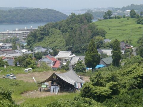 ![]() | 袋湾を臨む高台に建つテント。さらに向こうには水俣湾。旧袋中学校跡地です。 |