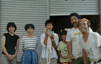 水俣でお世話になった方々。左から。宿泊場所を提供していただいた大沢さん親子。テントで一週間一緒に暮らした渓太君(中学生)。こうへいちゃんの娘さん葉月ちゃん。そしてヒゲのおじさまこそ3月の上々颱風コンサート、今回のどくんご公演の仕掛け人、こうへいちゃん。そして福岡の外山君。皆様お世話になりました。 |