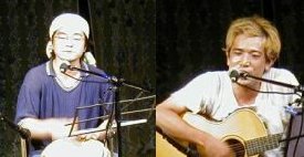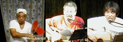 ![]() プレイベントその2、前日ライブに出演してくれた方々です。順番に、長短の棒と団扇をあやつる不思議な踊りを披露してくれた下田さん。水俣のシンガー、鶴坂さん、柏田さん、人気者池ぽん。九州公演にずっとつきあってくれた外山君は誕生日のこの日に場を得てメンバーの前で歌を歌ってくれた。みなさま、ありがとう。 |