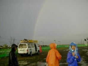 ![]() バラシ後、雨が上がって虹。こちらを向いているのが、大阪公演にもきてくれた小六生の詩織ちゃん。 |