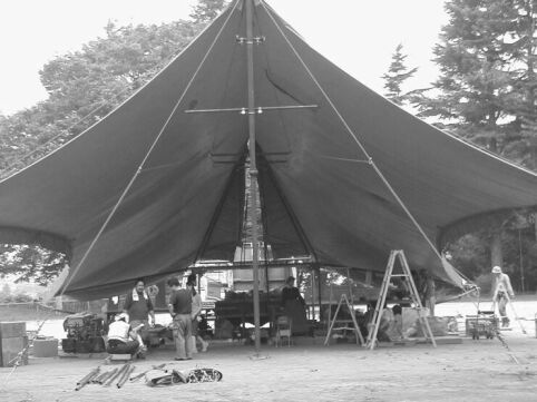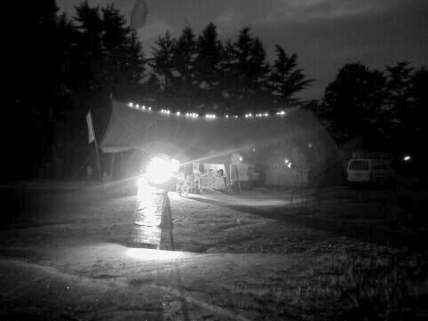 | 夜のテント。照明が錯綜して地面が凸凹に見えて、不思議な風景。 |
