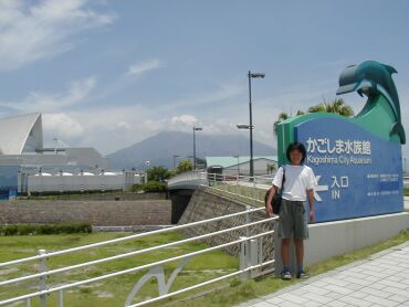 かごしま水族館前で記念写真の小六生、しんた。